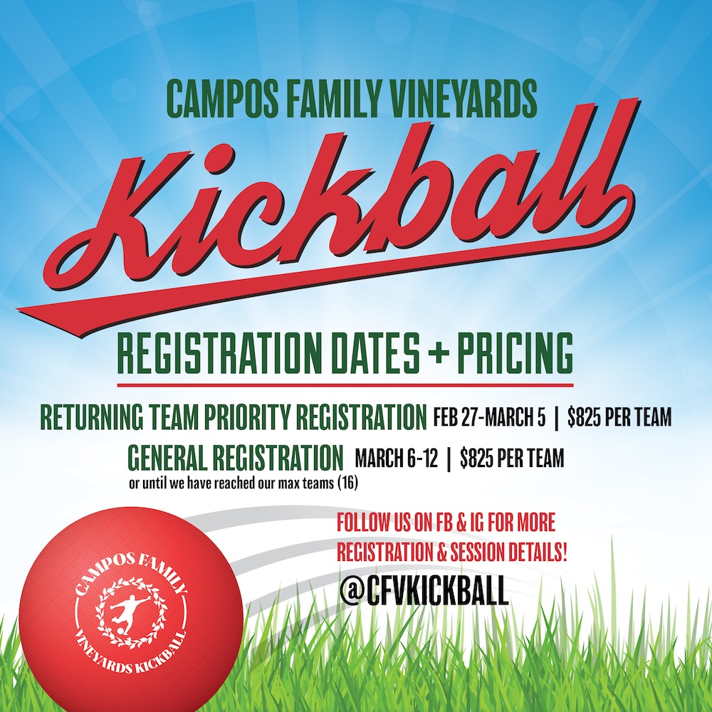 Campos Family Vineyards is kicking off another year of Kickball and we want YOU to join our league. This Kickball League was developed around our heart to draw families out to the property to enjoy award-winning wines and compete on our “Field of Dreams”.